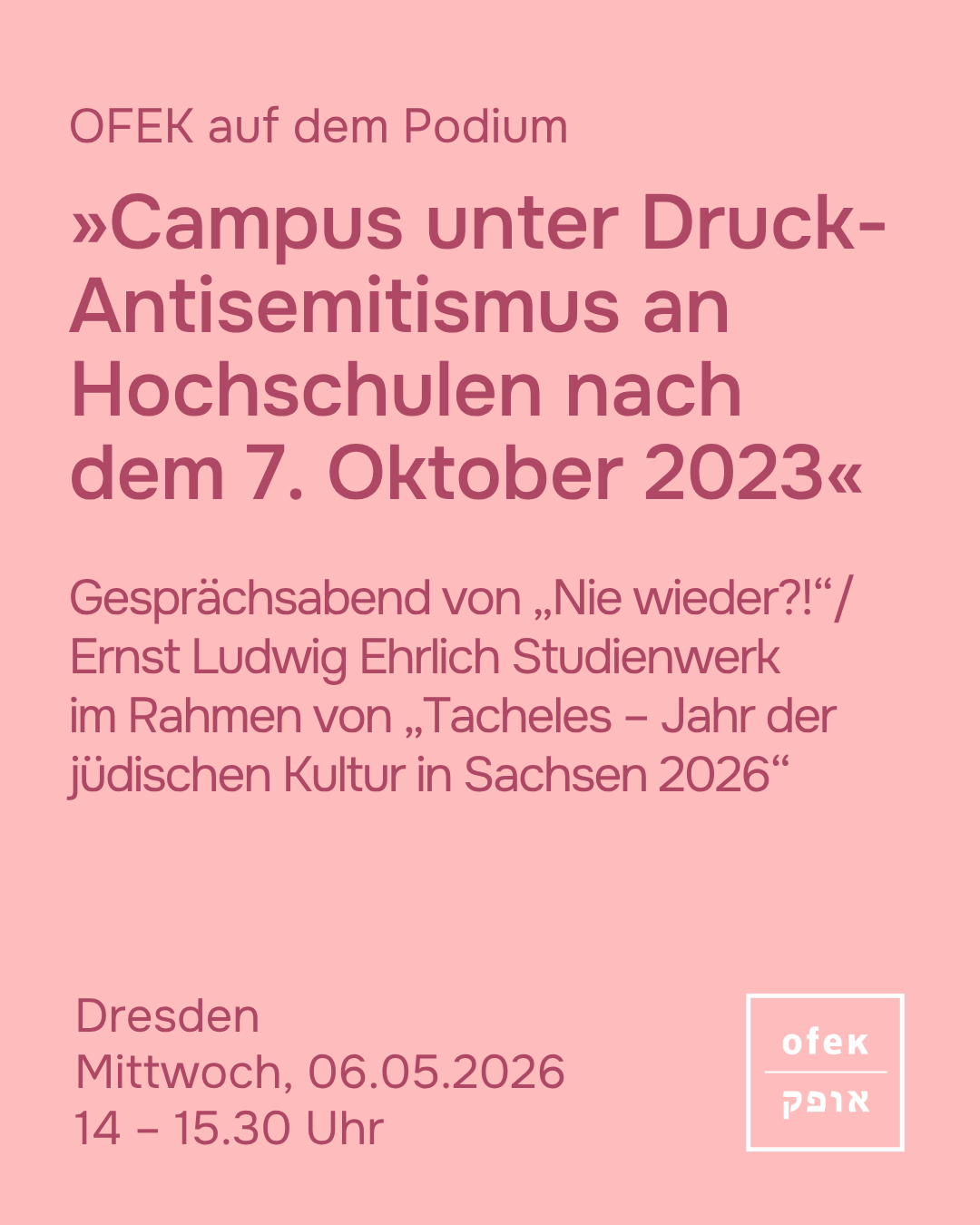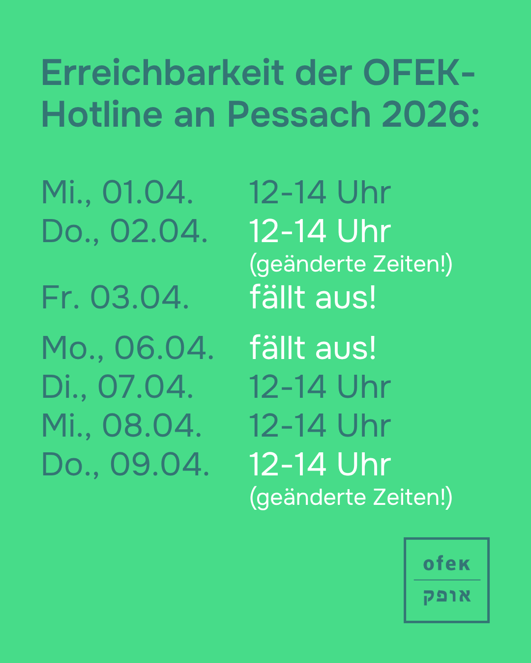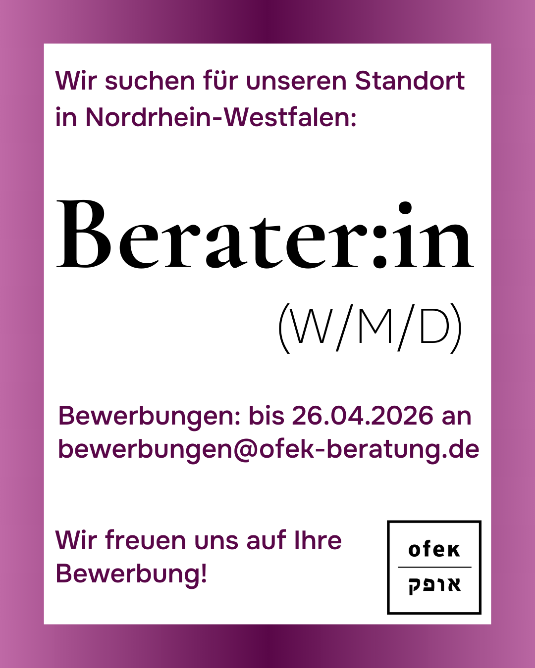 OFEK e.V. wurde 2017 in Berlin gegründet und ist die erste Fachberatungsstelle in Deutschland, die auf professionelle und Community-orientierte Beratung bei Antisemitismus spezialisiert ist. Wir beraten Betroffene, ihre Angehörigen und Zeug:innen antisemitischer Straftaten und Vorfälle und bieten je nach Bedarf psychosoziale, psychologische und rechtliche Beratung und Begleitung an. Darüber hinaus bieten wir Fachberatung für Institutionen und Kollektive und begleiten sie bei der Ausarbeitung von Interventionsplänen, Schutzkonzepten sowie bei antisemitismuskritischer Organisationsentwicklung. Zusätzlich führen wir Empowerment-Formate für die Community durch.