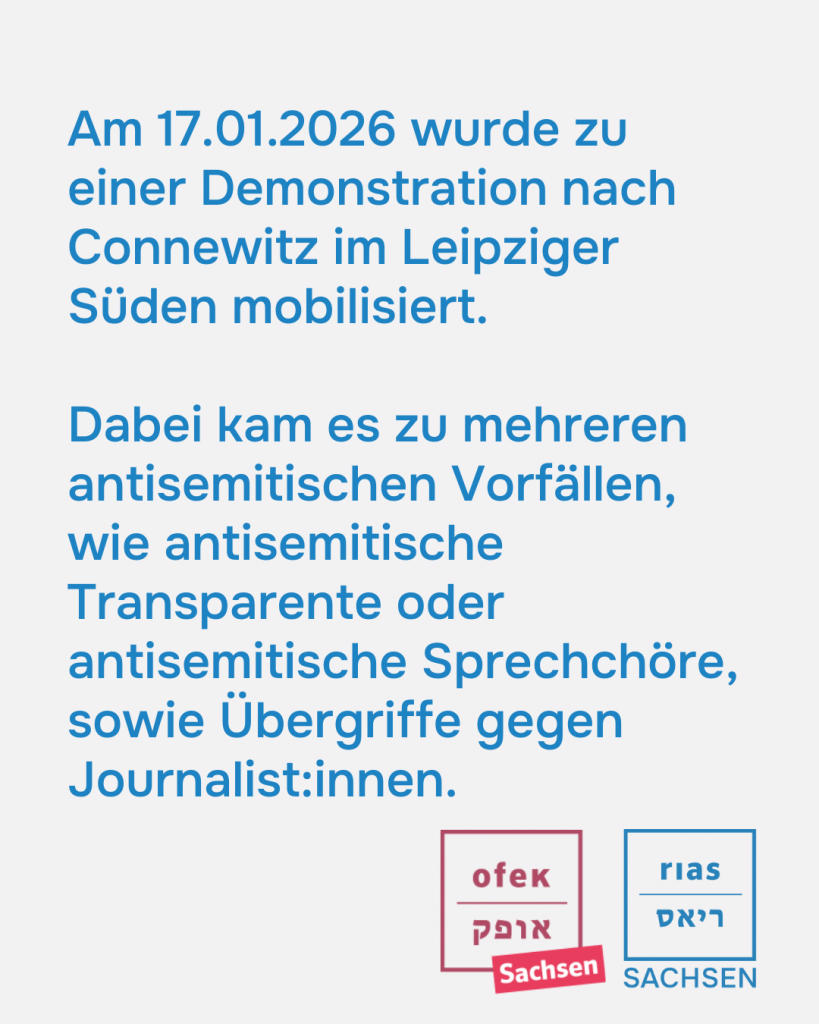Am 17.01.2026 wurde zu einer Demonstration nach Connewitz im Leipziger Süden mobilisiert. Dabei kam es zu mehreren antisemitischen Vorfällen, wie antisemitische Transparente oder antisemitische Sprechchöre, sowie Übergriffe gegen Journalist:innen.