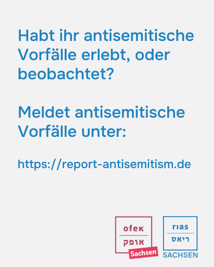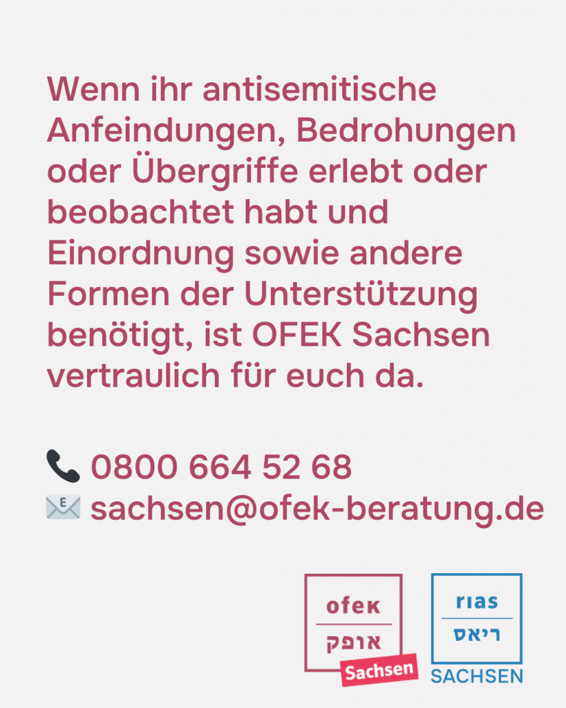 Wenn ihr antisemitische Anfeindungen, Bedrohungen oder Übergriffe erlebt oder beobachtet habt und Einordnung sowie andere Formen der Unterstützung benötigt, ist OFEK Sachsen vertraulich für euch da.