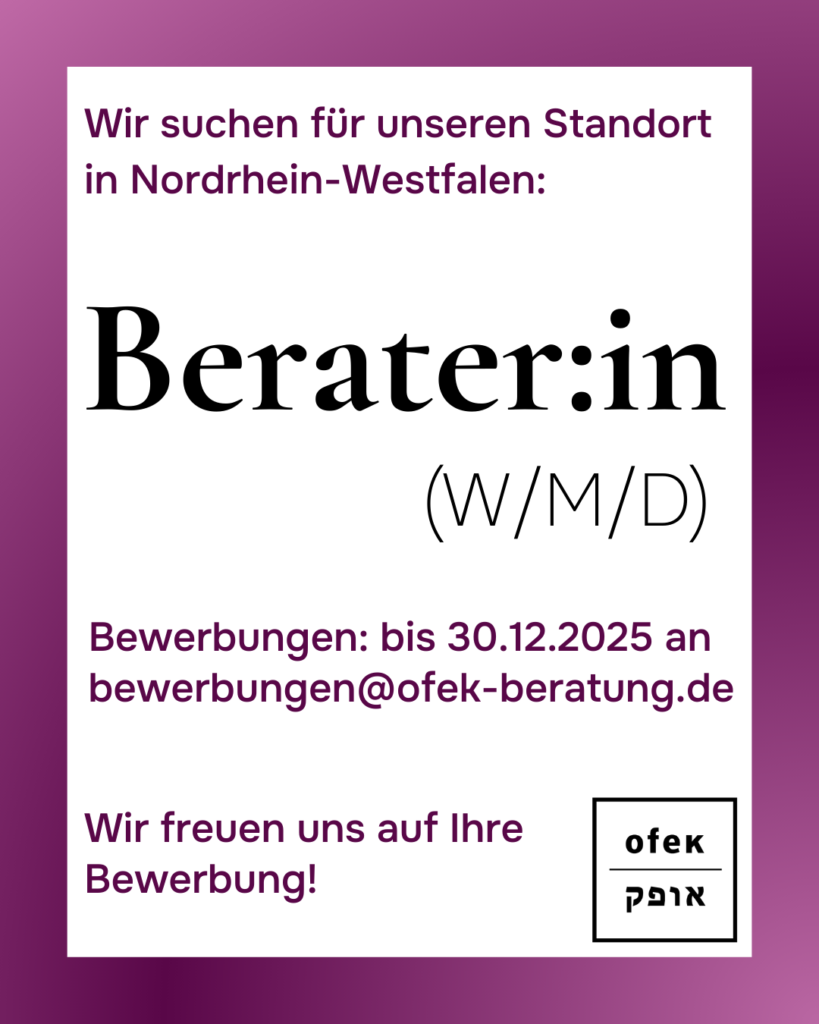 Die Beratungsstelle bei antisemitischer Gewalt und Diskriminierung OFEK e.V. sucht zum 01.01.2026 eine Berater:in für einen neuen Standort in Nordrhein-Westfalen. Die Stelle umfasst 30 Wochenstunden. Die Vergütung richtet sich nach TV-L. Die Stellen sind zunächst bis zum 31.12.2026 befristet, es besteht jedoch die Option auf Verlängerung.