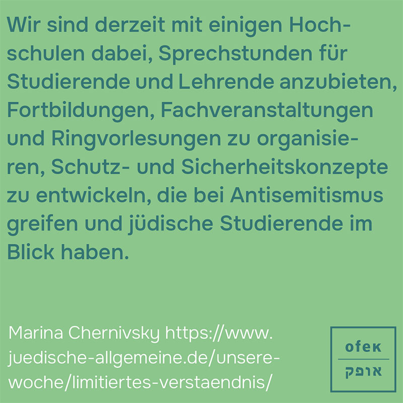 OFEK e.V. ist die erste Fachberatungsstelle in Deutschland, die auf Antisemitismus und Community-basierte Betroffenenberatung spezialisiert ist. OFEK berät, begleitet und unterstützt Betroffene, ihre Angehörigen sowie Zeug:innen antisemitischer Vorfälle und Gewalttaten. OFEK steht parteiisch an der Seite der Ratsuchenden und bringt jüdische Perspektiven in die gesellschaftliche und politische Debatte ein. Die Beratung von OFEK orientiert sich an den fachspezifischen Qualitätsstandards professioneller Opferberatung und bezieht sich auf alle Fälle mit sowie ohne Straftatbestand.