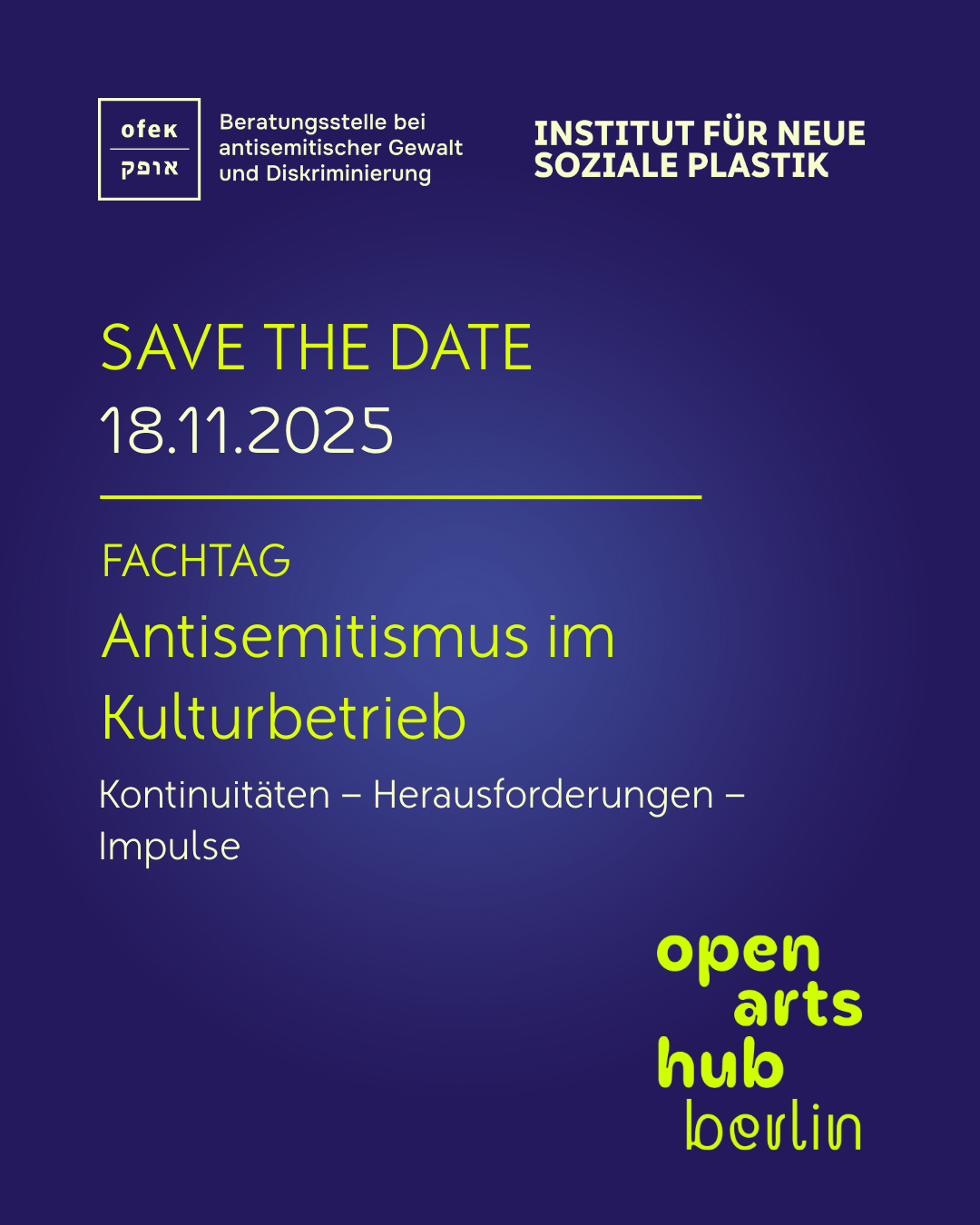 Der Open Arts Hub Berlin ist ein neues Projekt zum Umgang mit Antisemitismus im Berliner Kulturbetrieb. Er bündelt die Expertisen, Angebote und Unterstützungsstrukturen der beiden Träger OFEK e.V., der Beratungsstelle bei antisemitischer Gewalt und Diskriminierung, und des Institut für Neue Soziale Plastik.