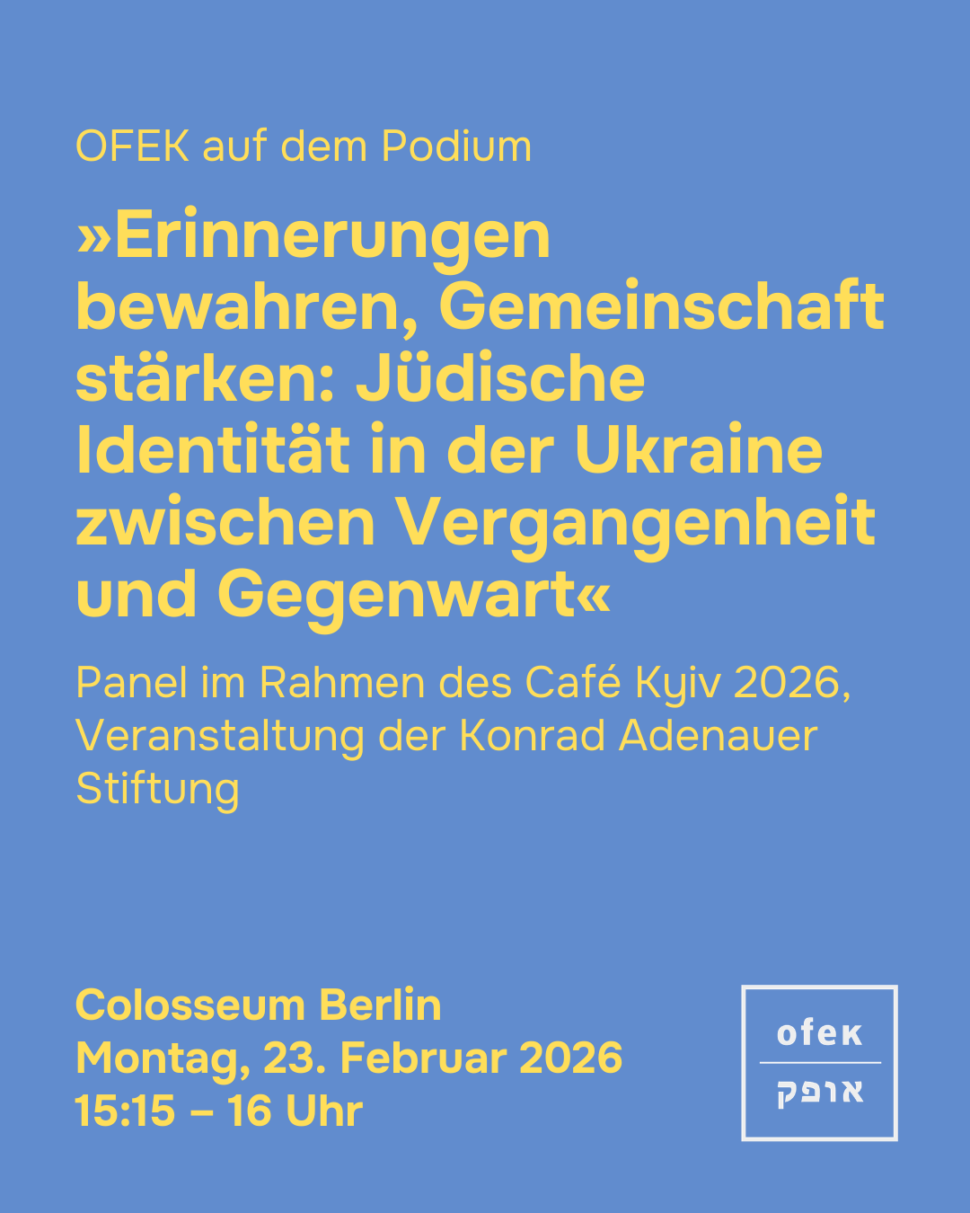 Am 23. Februar, am Tag vor dem Jahrestag des Beginns des vollflächigen Kriegs Russlands gegen die Ukraine, ist OFEK e.V.-Geschäftsführerin Marina Chernivsky beim Panel „Erinnerung bewahren, Gemeinschaft Stärken – Jüdische Identität in der Ukraine zwischen Vergangenheit und Gegenwart“ auf dem Podium. Das Panel findet im Zuge des Café Kyiv im Colosseum Berlin statt.